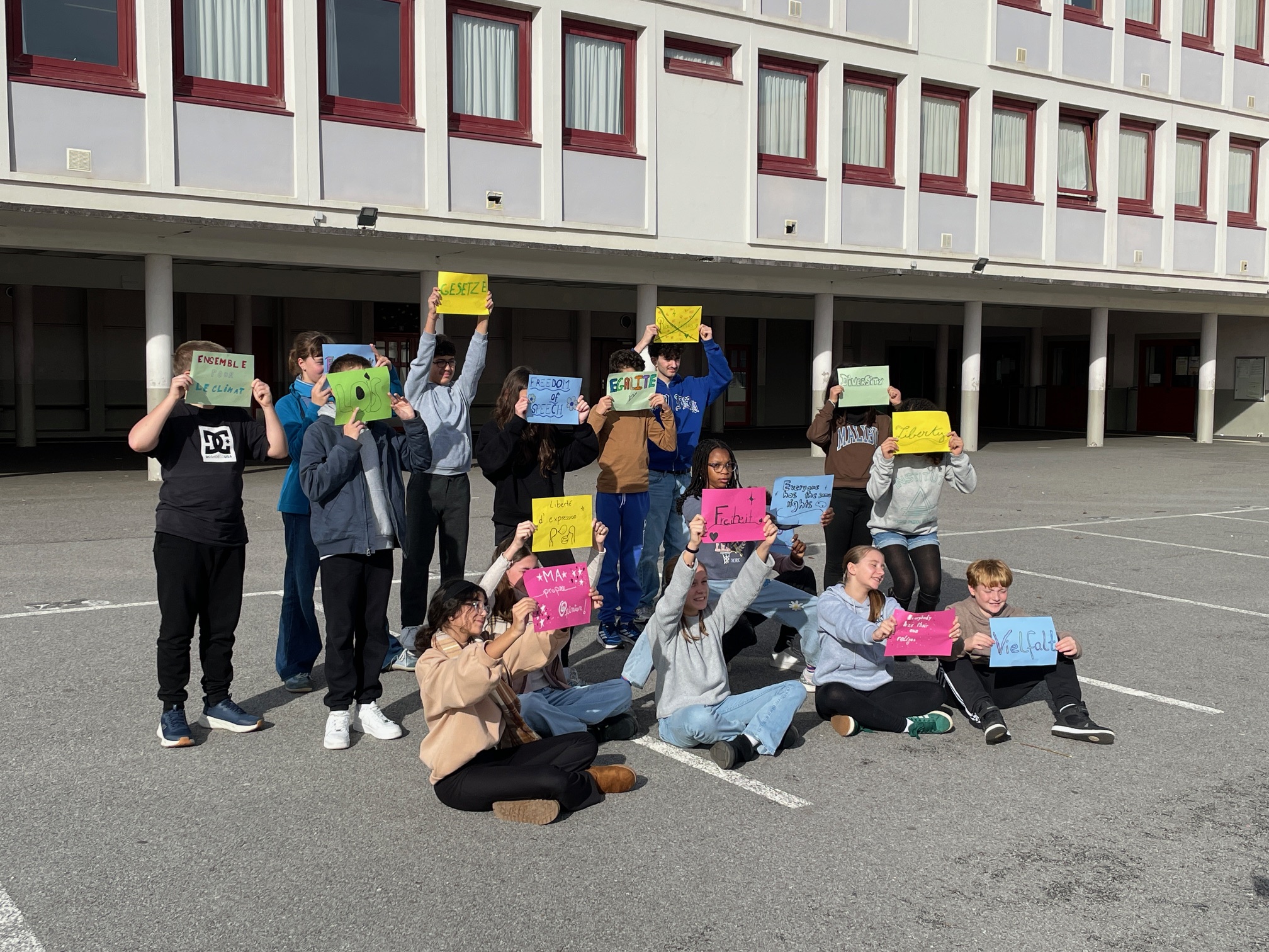 Après un petit déjeuner pris en commun, les élèves français ont fait découvrir leur collège à leurs correspondants en binômes pour plus de convivialité. La fin de matinée a été consacrée à un atelier bilingue sur le thème de la démocratie et de l’engagement citoyen : égalité, diversité, climat, liberté d’expression, lutte contre les fake news… tous les grands sujets du moment ont été discutés et mis en scène dans la cour avec des affiches réalisées par les élèves.